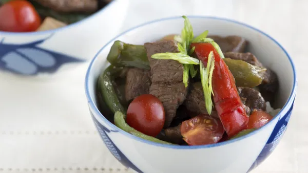 Step3Spray nonstick wok or 12-inch skillet with cooking spray; heat over medium-high heat. Add beef; stir-fry 2 minutes. Stir in bell peppers and onions and reserved marinade; reduce heat to medium.