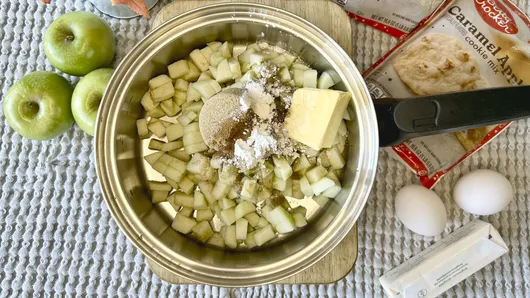 Step2In a medium saucepan, combine the Filling ingredients over medium-low heat, stirring frequently, until butter is melted and sugar is dissolved. Increase the heat to medium, and let it simmer for 5 minutes or until the apples are tender. Remove from heat, and let it cool.