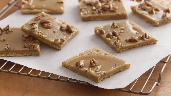 Step1Heat oven to 325°. Make Graham Cracker Crust. Line rectangular pan, 15 1/2 x10 1/2 inches, with aluminum foil. Mix all ingredients. Press in bottom of pan, using fork. Bake 8 to 10 minutes; cool.