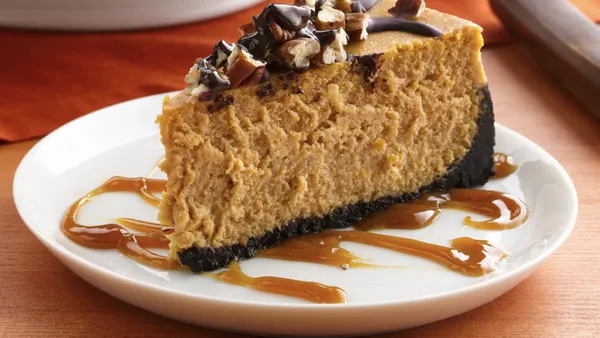 Step3Bake 1 hour 15 minutes to 1 hour 25 minutes or until edge is set but center still jiggles slightly. Turn oven off; open door 4 inches. Leave cheesecake in oven 30 minutes. Run knife around edge of pan to loosen. Cool on cooling rack 30 minutes. Refrigerate 6 hours or overnight. Run knife around edge of pan to loosen cheesecake; carefully remove side of pan. Top with whipped topping and candied pecans. Drizzle with caramel topping.