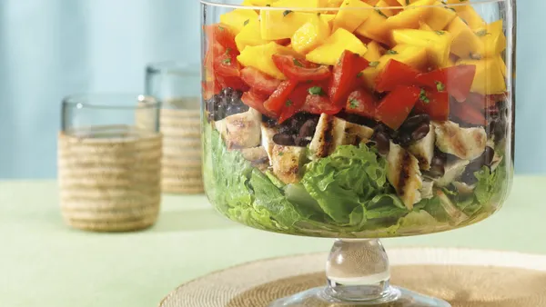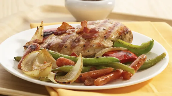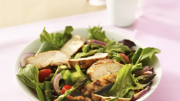 Step3Toss salad greens, peaches, onion and bell pepper in large bowl; divide evenly among 8 plates. Top with chicken. Drizzle with vinaigrette.