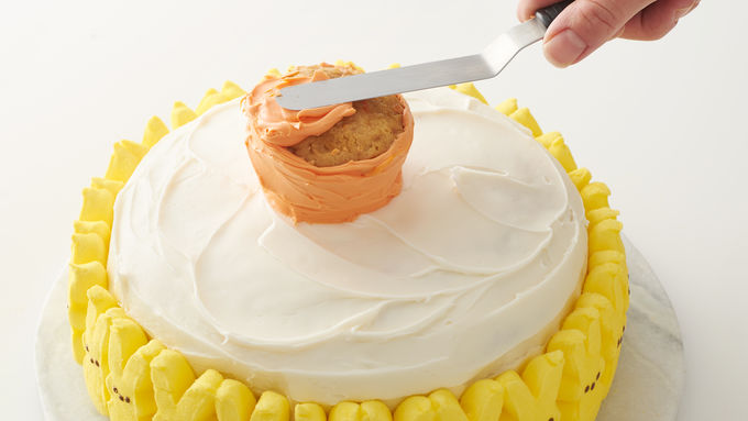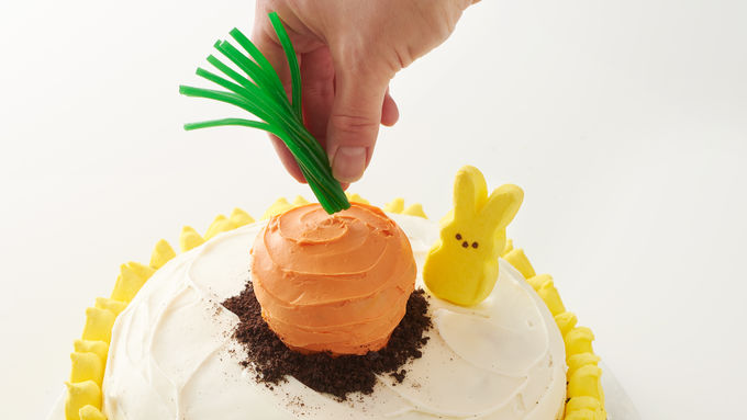 This fun and festive springtime dessert gives a whole new meaning to "carrot cake"! A cupcake frosted to look like a carrot top sits atop this two-tiered carrot cake covered in rich cream cheese frosting. It's decorated with adorable PEEPS® bunnies for an extra-sweet and playful look. It's sure to be the talk of your Easter gathering! MORE+ LESS-