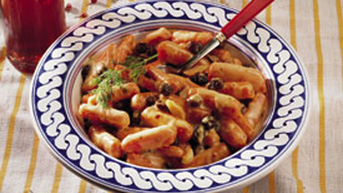 Step2Cook onions in butter in 3-quart saucepan over low heat 5 minutes, stirring occasionally, until onions begin to soften. Stir in carrots and raisins (with rum). Cook, stirring occasionally, until liquid has evaporated. Stir in wine, dill weed, salt and red pepper.