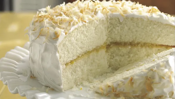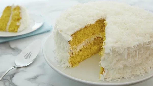 Step8To finish cake, sprinkle coconut onto sides.
