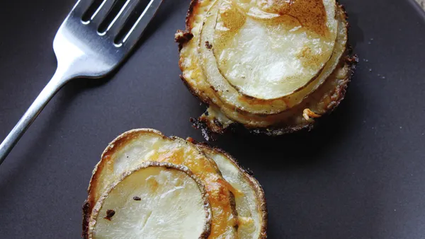 Step1Heat oven to 375°F. Spray 1 1/2-quart glass baking dish with cooking spray. Scrub potatoes but do not peel. Cut into 1/8-inch slices.