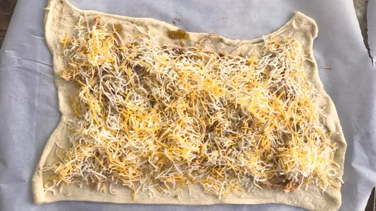 Step3Unroll 1 can dough. Press into rectangle filling most of the space on cookie sheet. Spread chicken mixture evenly on dough. Top evenly with cheese.