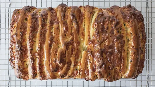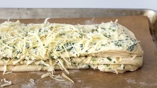 var configuration = {"title":"Cheesy Garlic Pull-Apart Bread","introduction":"\u003cp\u003eThere was a time, over a decade ago, when pull-apart breads were the viral recipe trend. Variations could be found on seemingly every recipe blog and for good reason! Essentially, a pull-apart bread is just a loaf made from shingles of dough, buttered in between, and sprinkled with a flavorful mix of ingredients. Our version is packed with herby garlic butter and lots of cheese. The result is a golden loaf that\u0027s fragrant with garlic and perfect for sharing. Instead of slicing, leaves of dough are peeled off, revealing an herb-speckled, buttery interior\u003ci\u003e just \u003c/i\u003eheld together with stretchy cheese. Be sure to serve warm for optimal cheese pull.\u003c/p\u003e","servingSize":" 1 Serving","image":{"small":{"media":"(min-width: 0px)","src":"https://mojo.generalmills.com/api/public/content/Ohxd6zAGS3mOWYc6DsFWmA_webp_base.webp?v=589ea25f\u0026t=e724eca7b3c24a8aaa6e089ed9e611fd"},"medium":{"media":"(min-width: 500px)","src":"https://mojo.generalmills.com/api/public/content/Ohxd6zAGS3mOWYc6DsFWmA_webp_base.webp?v=589ea25f\u0026t=191ddcab8d1c415fa10fa00a14351227"},"large":{"media":"(min-width: 767px)","src":"https://mojo.generalmills.com/api/public/content/Ohxd6zAGS3mOWYc6DsFWmA_webp_base.webp?v=589ea25f\u0026t=191ddcab8d1c415fa10fa00a14351227"},"alt":"Cheesy Garlic Pull-Apart Bread"},"contributor":{"label":"By","name":"Cindy Rahe","displayDate":{"label":"Updated","date":"Aug 15, 2025"}},"ingredientGroups":[{"name":"Dough","ingredients":[{"quantity":"1/4","description":"cup water, room temperature"},{"quantity":"1","description":"tablespoon honey"},{"quantity":"2 1/4","description":"teaspoons active dry yeast"},{"quantity":"3/4","description":"cup milk"},{"quantity":"1","description":"large egg"},{"quantity":"3 1/2","description":"cups Gold Medal™ All Purpose Flour"},{"quantity":"2","description":"tablespoons unsalted butter, melted"},{"quantity":"1","description":"teaspoon kosher salt"}]},{"name":"Filling","ingredients":[{"quantity":"1/2","description":"cup unsalted butter, softened"},{"quantity":"4","description":"to 6 cloves of garlic, grated or minced fine"},{"quantity":"2","description":"tablespoons chopped fresh chives"},{"quantity":"2","description":"tablespoons chopped fresh parsley"},{"quantity":"1/4","description":"teaspoon kosher salt"},{"quantity":"1","description":"cup shredded mozzarella cheese (4 oz)"},{"quantity":"1","description":"cup shredded Italian cheese blend (4 oz)"}]}],"steps":[{"description":"\u003cp\u003eCombine the water, honey, and yeast in the bowl of a stand mixer, and set aside for five minutes until the mixture is foamy. Add the milk and egg to the bowl, whisk gently to break the egg, then add the flour, salt, and melted butter. Using the dough hook, mix the dough on medium-low speed until a dough forms. You may need to use a spatula to combine the wet and dry ingredients. Turn the mixer up to medium and continue mixing for 10 minutes.\u003c/p\u003e"},{"description":"\u003cp\u003eShape the dough into a ball, place in an oiled bowl, and cover with plastic wrap.\u003c/p\u003e","stepShotImageUrl":"//mojo.generalmills.com/api/public/content/jav70AZnTVypXId4xs-F3g_webp_base.webp?v=f5e61c0d\u0026t=51a43a57af4046789e5a7f20567b1195"},{"description":"\u003cp\u003eAllow the dough to double in size at room temperature, about 1 hour. Alternatively, you can refrigerate the dough and allow it to rise for 8 to 12 hours. This is great if you want to make the dough ahead of time.\u003c/p\u003e","stepShotImageUrl":"//mojo.generalmills.com/api/public/content/91RkUo25TieNx1D63ZnOQg_webp_base.webp?v=080c4550\u0026t=51a43a57af4046789e5a7f20567b1195"},{"description":"\u003cp\u003eWhile the dough is rising, make the garlic butter. Combine the softened butter in a bowl with the garlic, herbs, and salt.\u003c/p\u003e"},{"description":"\u003cp\u003eOnce the dough has doubled, punch it down to deflate and roll out into about an 18x9-inch rectangle.\u003c/p\u003e","stepShotImageUrl":"//mojo.generalmills.com/api/public/content/9AQpMrUtSQmlg2yULrtLUQ_webp_base.webp?v=f3783c49\u0026t=51a43a57af4046789e5a7f20567b1195"},{"description":"\u003cp\u003eSpread the garlic butter over the entire surface of the dough and cover with the cheeses.\u0026nbsp;\u003c/p\u003e","stepShotImageUrl":"//mojo.generalmills.com/api/public/content/hcJNjj_wT5ujghyvYWJqrQ_webp_base.webp?v=d0567ee7\u0026t=51a43a57af4046789e5a7f20567b1195"},{"description":"\u003cp\u003eCut the rectangle into 3 strips lengthwise, stack the strips on top of each other, and cut into 6 portions. You will have 18 rough squares of dough.\u003c/p\u003e","stepShotImageUrl":"//mojo.generalmills.com/api/public/content/Hzr5ddKAR7OuLof_2UNY4A_webp_base.webp?v=8dfdebec\u0026t=51a43a57af4046789e5a7f20567b1195"},{"description":"\u003cp\u003eLightly butter a 9x5-inch loaf pan and arrange the dough squares upright in the pan. Be sure to have the buttered sides facing inward at the ends of the loaf pan (dry dough side toward the pan).\u003c/p\u003e","stepShotImageUrl":"//mojo.generalmills.com/api/public/content/kbrX4jwERKCgQnPN5k6afw_webp_base.webp?v=12072e7f\u0026t=51a43a57af4046789e5a7f20567b1195"},{"description":"\u003cp\u003eCover with plastic wrap and allow to rise for about 1 hour or until puffed and about doubled in size.\u003c/p\u003e","stepShotImageUrl":"//mojo.generalmills.com/api/public/content/L7RmDlUkT4uQN5VVJI86dw_webp_base.webp?v=a6f23b23\u0026t=51a43a57af4046789e5a7f20567b1195"},{"description":"\u003cp\u003eHeat the oven to 400°F.\u003c/p\u003e"},{"description":"\u003cp\u003ePlace the loaf pan on a baking sheet (to catch any garlic butter that may drip) and bake about 30 minutes or until golden. Remove from the oven and cool on a rack for 10-15 minutes before serving.\u003c/p\u003e","stepShotImageUrl":"//mojo.generalmills.com/api/public/content/LNzlGQlmRuSo1KbRG-JmPA_webp_base.webp?v=9686fe73\u0026t=51a43a57af4046789e5a7f205