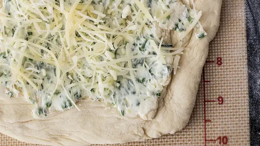 Spread the garlic butter over the entire surface of the dough and cover with the cheeses.