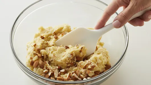 In large bowl, stir cookie mix, 1/2 cup softened butter, the cream cheese and egg until soft dough forms. Stir in almonds. Set aside.