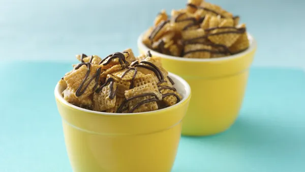 Step2In 1-quart microwavable bowl, microwave chocolate chips and butter on High 1 minute; stir. Microwave 30 seconds longer or until mixture can be stirred smooth. Pour over cereal mixture, stirring until evenly coated.