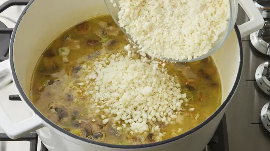 var configuration = {"title":"Chicken and Cauliflower Rice Soup","introduction":"Sometimes you need the comfort and healing power of chicken noodle soup but could do without the noodles. For those times, there’s this herby and aromatic soup featuring fresh ginger, jalapeño, green onion, basil and cilantro, and made complete with tender chunks of chicken thighs and a rich chicken broth. In place of noodles, this soup features cauliflower rice—find it in the freezer section of your grocery store. This cruciferous vegetable does double duty here by making a satisfying textural substitute for the rice or noodles you might normally add to your chicken soup, while also adding some healthful benefits—cauliflower is loaded with nutrients, fiber, vitamins and potassium. The final twist in this soup recipe is the tablespoon of soy sauce stirred in at the end for extra savory flavor that’ll have you coming back for a second bowl! So next time you need to heal your body or soul, do it with the help of this non-traditional but just-as-soothing chicken soup!","servingSize":"2 Cups","image":{"small":{"media":"(min-width: 0px)","src":"https://mojo.generalmills.com/api/public/content/nbkr2WN2k0qzTDw-EVsLRA_webp_base.webp?v=a369344c\u0026t=e724eca7b3c24a8aaa6e089ed9e611fd"},"medium":{"media":"(min-width: 500px)","src":"https://mojo.generalmills.com/api/public/content/nbkr2WN2k0qzTDw-EVsLRA_webp_base.webp?v=a369344c\u0026t=191ddcab8d1c415fa10fa00a14351227"},"large":{"media":"(min-width: 767px)","src":"https://mojo.generalmills.com/api/public/content/nbkr2WN2k0qzTDw-EVsLRA_webp_base.webp?v=a369344c\u0026t=191ddcab8d1c415fa10fa00a14351227"},"alt":"Chicken and Cauliflower Rice Soup"},"contributor":{"label":"By","name":"Betty Crocker Kitchens","profileUrl":"/about-us","displayDate":{"label":"Updated","date":"Nov 21, 2019"}},"ingredientGroups":[{"ingredients":[{"quantity":"4","description":"teaspoons vegetable oil"},{"quantity":"1 1/4","description":"lb boneless skinless chicken thighs, cut into 1/2-inch pieces"},{"quantity":"1/2","description":"teaspoon toasted sesame oil"},{"quantity":"1/2","description":"teaspoon salt"},{"quantity":"1/4","description":"teaspoon pepper"},{"quantity":"1","description":"package (8 oz) white mushrooms, sliced (about 2 1/2 cups) "},{"quantity":"4","description":"green onions, sliced, white parts and green parts separated"},{"quantity":"1","description":"tablespoon finely chopped fresh gingerroot"},{"quantity":"2","description":"teaspoons finely chopped garlic"},{"quantity":"2","description":"teaspoons seeded, finely chopped jalapeño chile"},{"quantity":"1","description":"large carrot, halved lengthwise and thinly sliced (about 1 cup)"},{"quantity":"1","description":"carton (32 oz) Progresso™ reduced sodium chicken broth"},{"quantity":"1","description":"package (10 oz) frozen riced cauliflower"},{"quantity":"1","description":"tablespoon soy sauce"},{"quantity":"1/4","description":"cup coarsely chopped fresh basil"},{"quantity":"1/4","description":"cup coarsely chopped fresh cilantro"},{"quantity":"","description":"Lime wedges, if desired"},{"quantity":"","description":"Sliced jalapeño chiles, if desired"}]}],"steps":[{"description":"In 5-quart Dutch oven, heat 2 teaspoons of the vegetable oil over medium-high heat. Toss chicken with sesame oil, 1/4 teaspoon of the salt and the black pepper. Add chicken to Dutch oven; cook 6 to 8 minutes, stirring once, until chicken is browned. Using slotted spoon, transfer mixture to bowl; cover to keep warm.","stepShotImageUrl":"//mojo.generalmills.com/api/public/content/ARrio8harkqdXynogBHZ6Q_webp_base.webp?v=8e5331f9\u0026t=51a43a57af4046789e5a7f20567b1195"},{"description":"Reduce heat to medium. Add remaining 2 teaspoons oil to Dutch oven. Add mushrooms and remaining 1/4 teaspoon salt; cook 4 to 5 minutes, stirring occasionally, until mushrooms are tender and starting to brown. Add white parts of onion, gingerroot, garlic, chopped jalapeño and carrots to Dutch oven; cook over medium heat 2 to 3 minutes, stirring frequently, until vegetables are starting to soften and are fragrant.","stepShotImageUrl":"//mojo.generalmills.com/api/public/content/exuo9Mja2E-KSpvpiQygFQ_webp_base.webp?v=f3efeb49\u0026t=51a43a57af4046789e5a7f20567b1195"},{"description":"Stir in broth; heat to boiling. Stir in chicken and cauliflower; return to boiling. Reduce heat; simmer uncovered 6 to 8 minutes, stirring occasionally, until cauliflower is tender. Stir in soy sauce and green parts of onion; divide among serving bowls.","stepShotImageUrl":"//mojo.generalmills.com/api/public/content/AfPwzqVE6EC8BceqoxTEEQ_webp_base.webp?v=e6c52e7b\u0026t=51a43a57af4046789e5a7f20567b1195"},{"description":"Garnish with basil and cilantro."}],"tips":[{"title":"","description":"Boneless skinless chicken breasts can be substituted for thighs in this recipe.","category":"Substitution","tipShots":[]},{"title":"","description":"Wear gloves when handling jalapeño, or any type of chile pepper, and remember not to touch your face or eyes. The seeds and membrane of the chiles can cause burns. Always wash your hands thoroughly after handling peppers. If you like, garnish your soup with sliced jalapeño.","category":"Techniques","tipShots":[]},{"title":"","description":"Kitchen Tested: 10/2019","category":"Kitchen Tested","tipShots":[]},{"title":"","description":"Riced cauliflower, or cauliflower rice as it’s often called, is cauliflower that’s been broken down into uniform-size pieces that resemble grains. It’s easy enough to make at home with a food processor—try it with this \u003ca href=\u0022https://www.bettycrocker.com/recipes/cauliflower-rice/fd811ca6-d9da-47f7-a9a0-a10e620ab56c\u0022\u003eCauliflower \u0022Rice\u0022 \u003c/a\u003erecipe—but we do like the convenience of buying it frozen, so it’s ready for weeknight meals. If you find you’re a fan, try swapping this ingredient in next time you make fried rice, stir-fry or another recipe featuring traditional 