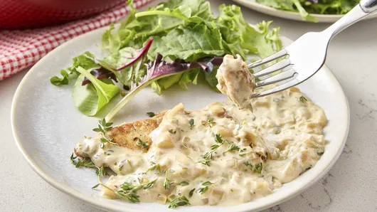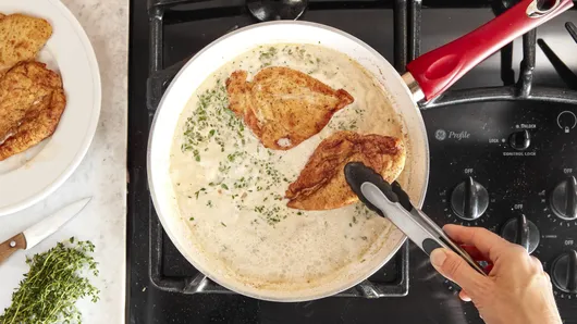 var configuration = {"title":"Chicken in Creamy White Wine Sauce","introduction":"\u003cp\u003eWho says gourmet can\u0027t be simple? This recipe will allow you to sharpen your cooking skills while creating a restaurant quality dish with our simple yet lavish Chicken in Creamy White Wine Sauce recipe. What could be more relaxing than taking some time to leisurely cook in your own kitchen. This savory, creamy, fragrant dish is a scrumptious delight you can make for any occasion. Easy and elegant, this dish can be enjoyed as a weeknight meal for the family or to celebrate a special event like a promotion at work. Why not make it for a date-night with your sweetie or to impress at your next dinner party? It’s just so versatile and appeals to most tastes.\u003c/p\u003e\n\u003cp\u003eThis recipe not only trumps any restaurant fare but also gives you a sense of culinary achievement. Once you learn the simple technique, you\u0027ll want to make it again and again.\u003c/p\u003e \n\u003cp\u003eThere is a magical interplay in the fragrant herbs, tender chicken and the creamy, white wine sauce. It will tantalize your palate with an unforgettable taste. The addition of wine is not just a treat for the gastronome but also a joy for the chef. What\u0027s more, the recipe and relaxed process gives you the license to sneak in a sip or a glass, as you achieve restaurant-quality taste in the coziness of your own kitchen.\u003c/p\u003e \n\u003cp\u003eSo pick your favorite white wine, from sauvignon blanc to chardonnay, and create culinary bliss for dinner tonight!\u003c/p\u003e","servingSize":"1 Chicken Cutlet with 3 Tablespoons Sauce","image":{"small":{"media":"(min-width: 0px)","src":"https://mojo.generalmills.com/api/public/content/zmdHaYi6QaWE68hY1EqvvA_webp_base.webp?v=eef7d29c\u0026t=e724eca7b3c24a8aaa6e089ed9e611fd"},"medium":{"media":"(min-width: 500px)","src":"https://mojo.generalmills.com/api/public/content/zmdHaYi6QaWE68hY1EqvvA_webp_base.webp?v=eef7d29c\u0026t=191ddcab8d1c415fa10fa00a14351227"},"large":{"media":"(min-width: 767px)","src":"https://mojo.generalmills.com/api/public/content/zmdHaYi6QaWE68hY1EqvvA_webp_base.webp?v=eef7d29c\u0026t=191ddcab8d1c415fa10fa00a14351227"},"alt":"Chicken in Creamy White Wine Sauce"},"contributor":{"label":"By","name":"Betty Crocker Kitchens","profileUrl":"/about-us","displayDate":{"label":"Updated","date":"Jul 26, 2024"}},"ingredientGroups":[{"ingredients":[{"quantity":"2","description":"boneless skinless chicken breasts (1 lb)"},{"quantity":"2","description":"tablespoons Gold Medal™ All-Purpose Flour"},{"quantity":"1/2","description":"teaspoon salt"},{"quantity":"1/4","description":"teaspoon pepper"},{"quantity":"3","description":"tablespoons butter"},{"quantity":"1/2","description":"cup chopped shallots"},{"quantity":"2","description":"cloves garlic, finely chopped"},{"quantity":"1","description":"cup dry white wine (such as Sauvignon Blanc)"},{"quantity":"1","description":"cup heavy whipping cream"},{"quantity":"2","description":"tablespoons chopped fresh Italian (flat-leaf) parsley leaves, plus additional for garnish"},{"quantity":"1","description":"tablespoon chopped fresh thyme leaves, plus additional for garnish"}]}],"steps":[{"description":"Cut chicken breasts in half horizontally, making 4 cutlets. Between 2 pieces of plastic wrap, place each chicken cutlet; gently pound with flat side of meat mallet or rolling pin until about 1/4 inch thick.","stepShotImageUrl":"//mojo.generalmills.com/api/public/content/JZG0Z2yCTl6clZz3a3_RWg_webp_base.webp?v=eff57436\u0026t=51a43a57af4046789e5a7f20567b1195"},{"description":"In large bowl, mix flour, salt and pepper. Add chicken cutlets, and turn to coat.","stepShotImageUrl":"//mojo.generalmills.com/api/public/content/UJ18EF_QT6mS6YUZ8hLamQ_webp_base.webp?v=a09c57b0\u0026t=51a43a57af4046789e5a7f20567b1195"},{"description":"In 12-inch skillet, melt butter over medium-high heat. Add chicken; cook 3 to 4 minutes without moving, until browned. Turn chicken; reduce heat to medium, and cook 2 to 3 minutes longer or until browned on second side and chicken is cooked through (at least 165°F). Transfer chicken to plate; cover with foil to keep warm.","stepShotImageUrl":"//mojo.generalmills.com/api/public/content/HKjKgCL7SUGHfHGtHe9wBg_webp_base.webp?v=fc59c702\u0026t=51a43a57af4046789e5a7f20567b1195"},{"description":"Add shallots to drippings in pan; cook over medium heat 3 to 5 minutes, until softened. Stir in garlic; cook 30 seconds longer. Slowly stir in wine and heat to boiling, stirring frequently; cook 4 to 6 minutes, until most of liquid is evaporated. Stir in whipping cream and herbs; heat to simmering, stirring frequently. Return chicken to pan; return to simmering, and continue to cook 5 to 7 minutes, turning chicken once, until sauce thickens slightly.","stepShotImageUrl":"//mojo.generalmills.com/api/public/content/mio_K2oHQqiW4aGn5A76tw_webp_base.webp?v=a8bb5f3d\u0026t=51a43a57af4046789e5a7f20567b1195"},{"description":"Top chicken and sauce with additional chopped fresh parsley and thyme.","stepShotImageUrl":"//mojo.generalmills.com/api/public/content/z8_ABAUeQdyvkGmX_HiAZQ_webp_base.webp?v=d93cdaae\u0026t=51a43a57af4046789e5a7f20567b1195"}],"tips":[{"title":"","description":"Indulgent chicken in a creamy, herbed white wine sauce is an elegant yet accessible home cooked dish, promising delight and simplicity.","category":"Rich Snippet","tipShots":[]},{"title":"","description":"Serve with roasted new potatoes and mixed greens in a citrus vinaigrette.","category":"Serving Suggestions/Menu","tipShots":[]},{"title":"","description":"The type of wine you use for this recipe is important. Since luscious cream can also dampen other flavors, a tart white wine like Sauvignon Blanc can balance the richness and add acid to make the sauce more interesting.","category":"Recipe/Ingredient Facts","tipShots":[]},{"title":"","description":"The term for the thickness of the wine and shallot mixture in this sauce method is 