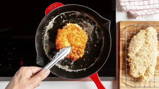 Fry the coated chicken in hot oil until it’s crispy and golden brown on both sides. To simplify this step a bit, you can fry the chicken in batches. Once a batch is done, place the fried chicken on a baking sheet and keep it warm in a 250°F oven while you fry the remaining pieces.