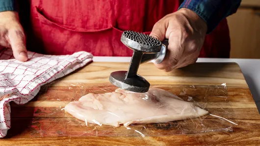 You can use either boneless skinless chicken breasts or thighs for this chicken katsu recipe. Start by lightly pounding the chicken to ensure it’s not too thick. This helps the chicken cook evenly and gives you the perfect texture.