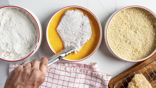 The second key to the crunchiest chicken is, of course, the breading. When you’re coating the chicken, make sure both sides of the chicken breast are fully coated in flour before dipping in the egg. To get that nice, full coverage, allow all the excess egg to drip off before pressing the chicken firmly into the panko bread crumbs.