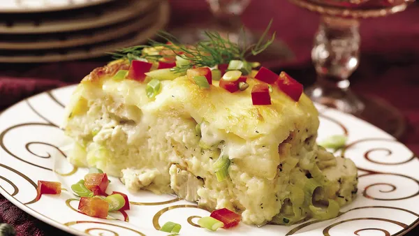 Step2Cut enough bread into 1-inch cubes to measure 5 cups. Mix bread cubes, leeks, chicken and dill weed. Spread bread mixture in ungreased square baking dish, 8x8x2 inches. Sprinkle with cheese. Mix remaining ingredients; pour over cheese. Cover tightly and refrigerate at least 4 hours but no longer than 24 hours.