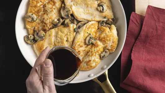 Add your coated chicken breasts and cook for about 8 minutes, turning once, until brown. To complete your Chicken Marsala sauce, add your wine and continue cooking until the chicken is no longer pink in the center and reaches an internal temperature of at least 165°F.