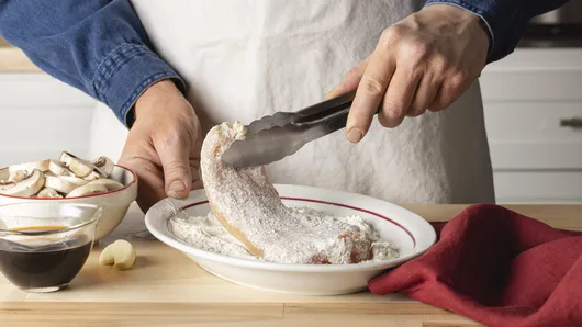 First, flatten your chicken breasts to make them tender and thin for even cooking. Coat them with a mixture of flour, salt, and pepper.