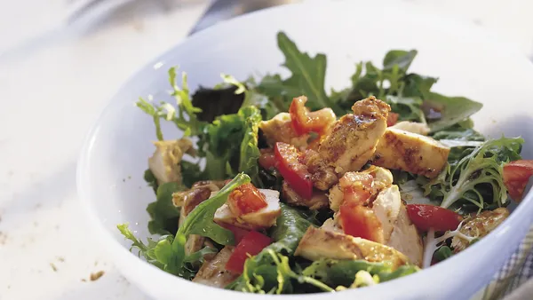 Step4In 12-inch nonstick skillet, heat 2 tablespoons oil over medium heat. Add chicken; cook 8 to 10 minutes, turning once, until juice of chicken is clear when center of thickest part is cut (170°F) and coating is golden brown. Serve chicken topped with salad and sprinkled with cheese.