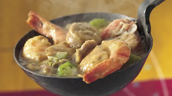 var configuration = {"title":"Chicken, Sausage, and Shrimp Gumbo","introduction":"\u003cp\u003eGumbo, a cornerstone of Louisiana cuisine, is a thick, hearty, savory soup with roots spanning several continents and cultures. Gumbo tells a culinary tale of cultural transformation and resilience. It\u0027s more than a dish – it’s a history lesson in a bowl. This melting pot of ingredients brings together flavors and cultural influences from Africa, Spain, France, and North America to create a truly unique culinary experience.\u003c/p\u003e \n\u003cp\u003eIrresistibly comforting, gumbo is a filling dish brimming with accessible ingredients that bring together Louisiana’s distinct combination of regional flavors and various protein sources. It\u0027s exactly what you need for a heart-warming dinner on a chilly evening or a hearty lunch that sticks with you throughout the day.\u003c/p\u003e\n\u003cp\u003eWhile you will often hear both “Creole” and “Cajun” used to describe dishes from Louisiana, there are a few differences between these styles of cooking that result in variations in their gumbos as well. Creole cooking is usually associated with chic city dishes, while Cajun cooking tends to refer to more relaxed country cooking. In addition to the cooking style, ingredients also differ between the two. Creole-style recipes often incorporate tomatoes and fancier proteins like oysters, crab, and shrimp, while Cajun-style recipes opt for more rustic, local ingredients like pork and crawfish. But a dark roux – a flour and oil mixture slowly cooked until chocolate in color – and smoked andouille sausage are classic components of both styles.\u003c/p\u003e\n\u003cp\u003eGumbo is typically served during family gatherings, celebrations, or parties. But why not enjoy it any day? Even better, mark your calendars because October 12th is an extra special day to gather \u0027round the pot - National Gumbo Day in the United States!\u003c/p\u003e\n\u003cp\u003eAt heart, our easy gumbo recipe combines two classic gumbo styles, merging traditional chicken and sausage gumbo and seafood gumbo all in one pot. With precooked chicken, smoked andouille sausage, and quick-cooking shrimp, this gumbo takes advantage of easy proteins to add tons of flavor and interest.\u003c/p\u003e\n\u003cp\u003eUsually, gumbo takes hours to prepare, gently building layers of flavors as it reduces and thickens. Our version adds black-eyed peas for extra thickening power and skips the long simmer without sacrificing flavor, since it’s loaded with so many tasty ingredients.\u003c/p\u003e\n\u003cp\u003eOur gumbo recipe is designed with family convenience in mind. By utilizing Progresso™ soup as a shortcut ingredient and using more common ingredients, we\u0027ve made this recipe accessible to home cooks of all skill levels and schedules. It\u0027s likely to become a new beloved dish to add to your repertoire!\u003c/p\u003e","servingSize":"1 Serving","image":{"small":{"media":"(min-width: 0px)","src":"https://mojo.generalmills.com/api/public/content/ZLdnQ5mnQruBhZX66RahoA_webp_base.webp?v=b6470b40\u0026t=e724eca7b3c24a8aaa6e089ed9e611fd"},"medium":{"media":"(min-width: 500px)","src":"https://mojo.generalmills.com/api/public/content/ZLdnQ5mnQruBhZX66RahoA_webp_base.webp?v=b6470b40\u0026t=191ddcab8d1c415fa10fa00a14351227"},"large":{"media":"(min-width: 767px)","src":"https://mojo.generalmills.com/api/public/content/ZLdnQ5mnQruBhZX66RahoA_webp_base.webp?v=b6470b40\u0026t=191ddcab8d1c415fa10fa00a14351227"},"alt":"Chicken, Sausage, and Shrimp Gumbo"},"contributor":{"label":"By","name":"Betty Crocker Kitchens","profileUrl":"/about-us","displayDate":{"label":"Updated","date":"Jun 28, 2024"}},"ingredientGroups":[{"ingredients":[{"quantity":"1/2","description":"cup peanut oil"},{"quantity":"1/2","description":"cup Gold Medal™ all-purpose flour"},{"quantity":"1","description":"cup chopped sweet onion"},{"quantity":"1","description":"cup chopped green bell pepper"},{"quantity":"1","description":"cup chopped celery"},{"quantity":"2","description":"teaspoons Creole seasoning"},{"quantity":"2","description":"teaspoons finely chopped garlic"},{"quantity":"5 1/4","description":"cups Progresso™ reduced sodium chicken broth (from two 32-oz cartons)"},{"quantity":"4","description":"cups shredded cooked chicken"},{"quantity":"1/2","description":"lb andouille sausage, cut into 1/4-inch slices"},{"quantity":"1 1/2","description":"cups frozen black-eyed peas, thawed"},{"quantity":"1","description":"lb uncooked extra-large (16 to 20 count) shrimp, peeled (tail shells removed), deveined"}]}],"steps":[{"description":"In 4- to 6-quart Dutch oven, heat oil over medium-high heat. Gradually stir in flour with whisk; cook 5 to 7 minutes, stirring constantly, until flour is chocolate colored. (Do not burn mixture.)","stepShotImageUrl":"//mojo.generalmills.com/api/public/content/HlWae7b1S86r8AhvkPgcIw_webp_base.webp?v=f98d3e00\u0026t=51a43a57af4046789e5a7f20567b1195"},{"description":"Reduce heat to medium. Stir in onion, bell pepper, celery, Creole seasoning and garlic. Cook 3 minutes, stirring constantly. Gradually stir in broth. Add chicken, sausage and black-eyed peas. Heat to boiling over medium-high heat; reduce heat to low. Simmer 20 minutes, stirring occasionally.","stepShotImageUrl":"//mojo.generalmills.com/api/public/content/AI_YAibISxO6UFvqBhNCwg_webp_base.webp?v=1e1b74dc\u0026t=51a43a57af4046789e5a7f20567b1195"},{"description":"Stir in shrimp; cook 5 minutes or just until shrimp are pink.","stepShotImageUrl":"//mojo.generalmills.com/api/public/content/OebQa-HnTx-Pqcu0qb7uXw_webp_base.webp?v=4a1cfac7\u0026t=51a43a57af4046789e5a7f20567b1195"},{"description":"Serve immediately with hot cooked rice or bread as desired.","stepShotImageUrl":"//mojo.generalmills.com/api/public/content/MCmBbvMSSjGEZKX51IHidA_webp_base.webp?v=0d13fcc1\u0026t=51a43a57af4046789e5a7f20567b1195"}],"tips":[{"title":"","description":"Our chicken, sausage, and shrimp gu