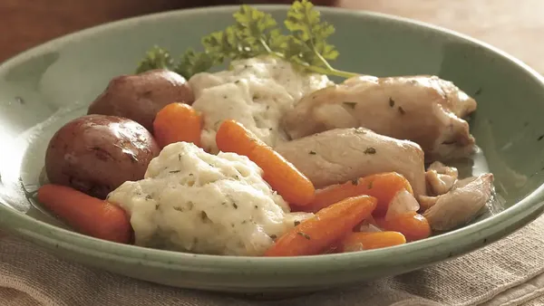 Step2In small bowl, stir Bisquick mix and milk with fork until soft dough forms. Drop dough by 18 teaspoonfuls onto boiling soup. If dumplings sink into soup, carefully bring them to top of broth using slotted spoon. Reduce heat to medium-low.