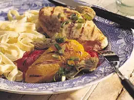 Step2Heat gas or charcoal grill. Remove chicken and bell peppers from marinade; reserve marinade. Place chicken on grill over medium heat. Cover grill; cook 5 minutes. Turn chicken; add bell peppers to grill. Cover grill; cook 10 to 15 minutes or until peppers are tender and juice of chicken is clear when center of thickest part is cut (165°F).