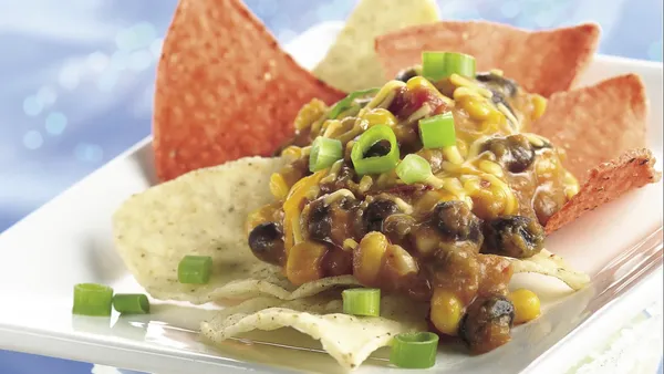 Step3Bake about 15 minutes or until mixture is hot and cheese is melted. Sprinkle with onions. Garnish with chile half. Serve with tortilla chips.