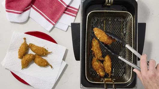 It should only take 2 to 3 minutes to give the poppers a beautiful golden-brown color and crispy texture—if you have the oil at the correct temperature. The temperature of the oil will fluctuate as you add and cook the poppers, so be ready to adjust the heat as is needed to maintain 350 °F. When the poppers are first added to the oil, it’s likely the temp will go down, but as they cook, it will rise again. And the temperature will continue to rise if you aren’t cooking any of the poppers.