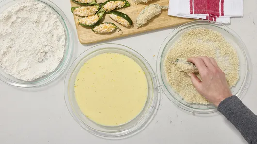 In one of three pie plates or shallow bowls, mix the flour, salt, and pepper. In the second, beat the milk and egg with a fork to break up the egg. Place the breadcrumbs in the third. Working with one stuffed jalapeños at a time, roll it first in the flour, then in the egg mixture, and last in the bread crumbs. This extra step wraps the poppers in a crispy-fried blanket that puts these little cuties into the appetizer hall of fame. Have all your poppers coated and ready for the hot oil before you start frying.