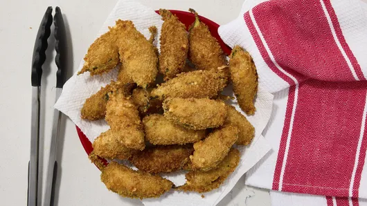 Fry the poppers in batches so they don’t overcrowd the pan. The space allows for the poppers to cook and easily be turned without touching each other. Fry the coated jalapeños until they are golden brown on all sides. If the cheese starts to ooze out, remove the chiles immediately. Be sure to watch the temperature of the oil and adjust the heat as necessary to keep it at 350°F. It’s easy to do just place a candy thermometer in the oil before you heat it which makes sure it is easy to read the temperature as you cook the poppers.