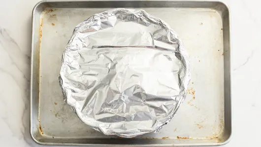 Spray a piece of foil with cooking spray, and place sprayed side down over the top of the pan; cover tightly. Place cake pan in a large roasting pan; add 1 inch of hot water to the roasting pan.