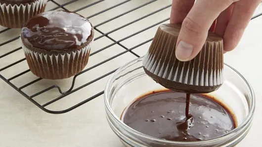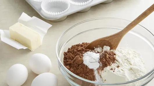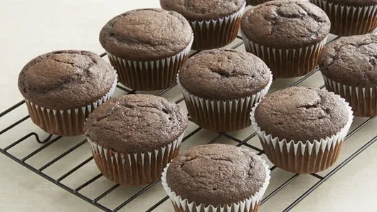 Let eggs stand at room temperature 30 minutes. Meanwhile, place paper baking cup in each of 24 regular-size muffin cups. In medium bowl, mix flour, cocoa, baking soda and baking powder.