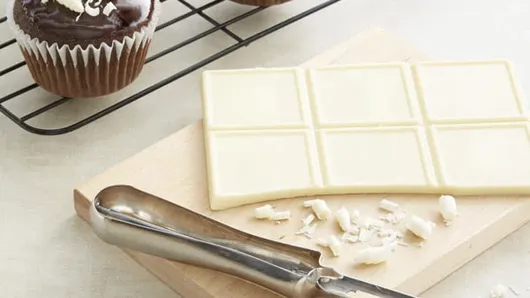 To make white chocolate curls, pull a swivel-bladed vegetable peeler down the edge of white chocolate bar, using long, thin strokes. Sprinkle each cupcake with about 2 teaspoons white chocolate curls, using toothpick to lift curls. Let stand at room temperature until ganache is set, about 2 hours. Store at room temperature.