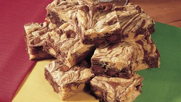 Step2In large bowl, beat brown sugar and butter with electric mixer on medium speed until light and fluffy. Beat in peanut butter, vanilla and eggs until well blended. Stir in flour and baking powder. Stir in chocolate chunks. Spread in pan.
