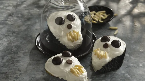 Step2In large bowl, beat butter and shortening with electric mixer on medium speed 2 minutes or until creamy. Slowly beat in powdered sugar and vanilla. Mound about 2 tablespoons frosting on each cupcake. Using fingers, make deep indentations in sides of frosting to look like skull.