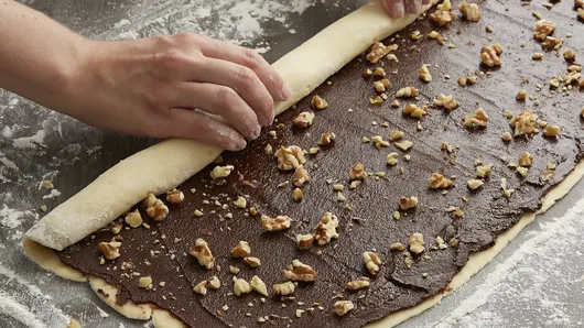 Step5On lightly floured surface, roll out chilled dough to 12x20-inch rectangle. Spread filling evenly over dough to edges. Sprinkle walnuts evenly on top. Roll dough up, starting at one long side; pinch seam to seal. Place seam side down on work surface. Using sharp knife, slice dough lengthwise to within 1/2 inch from bottom of dough. Keeping cut sides up, bring ends together, twisting dough together. Place in loaf pan in rough coil. Cover and let rise about 2 hours or until doubled.