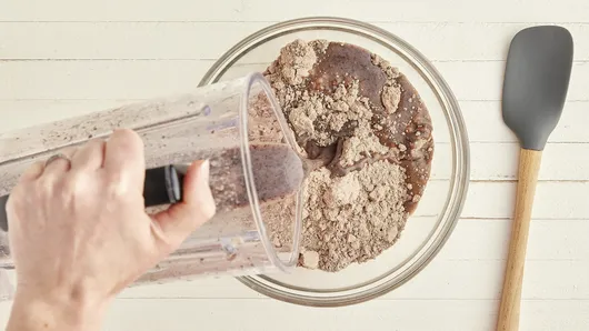 Step3In large bowl, mix bean mixture and brownie mix until well mixed. Spread batter evenly in pan.