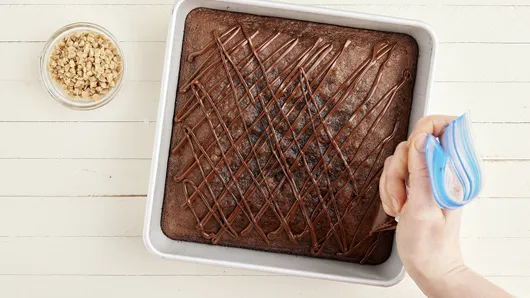 Step5Meanwhile, in small microwavable bowl, microwave chocolate chips uncovered on High 30 seconds; stir. Continue to microwave in 15-second increments, stirring after each, until chips can be stirred smooth. Spoon into resealable food-storage plastic bag; partially seal bag. Cut small tip from corner of bag; drizzle chocolate over top of hot brownies. Immediately sprinkle toffee chips over top.