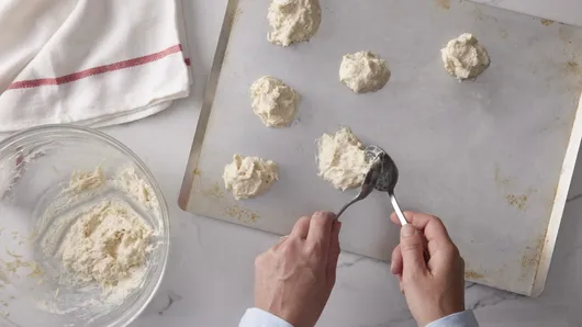 Step2Drop dough by 8 spoonfuls onto ungreased cookie sheet.