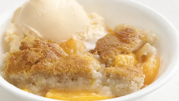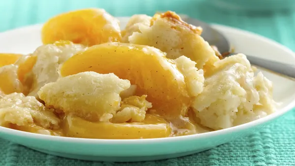 var configuration = {"title":"Classic Bisquick™ Peach Cobbler","introduction":"\u003cp\u003eWhen it comes to ingredients, we believe less is more. Sometimes the simplest desserts turn out to be the most delicious; and this peach cobbler is the perfect example. With its warm, juicy filling of delicate peaches, cozied up under a buttery, golden topping, this easy peach cobbler recipe is a quick way to whip up a classic dessert that\u0027s positively bursting with decadent fruit flavor. It\u0027s perfect for a special occasion or a weekday treat, and it’s super easy to make thanks to \u003ca href=\u0022https://www.bettycrocker.com/products/bisquick/\u0022\u003eBisquick™ Original Pancake \u0026 Baking Mix\u003c/a\u003e.\u003c/p\u003e\n\u003cp\u003eSo, what exactly is a cobbler? The flavors are very similar to a traditional fruit pie, but with a slightly more laid-back presentation. Instead of a neat, rolled-out pastry crust, a cobbler has a more rustic, biscuit-like topping simply dolloped on top. This gives the dessert its charming, “cobbled” appearance—like the cobblestone streets of 1800’s England that the dessert was named after. The result is a delightful mix of textures: a soft, syrupy filling with a slightly crispy topping.\u003c/p\u003e\n\u003cp\u003eCobblers can feature a wide array of different fruits, from cherries to berries, apples to sweet potatoes--but peach cobbler may be one of the most-loved varieties. And it’s easy to see why. Peaches have a light but sweet flavor that positively screams summer. Though using fresh peaches for cobbler is always amazing, our easy delicious peach cobbler recipe uses canned fruit to make prep an absolute breeze.\u003c/p\u003e\n\u003cp\u003eThis incredible cobbler recipe comes together with just a few simple ingredients, giving you an easy dessert that’s guaranteed to please—especially when served warm with a generous scoop of vanilla ice cream. Whether you serve this no-fuss peach cobbler at a picnic, a backyard barbecue, or just because, this dreamy dessert is bound to bring smiles all around.\u003c/p\u003e","servingSize":"1 Serving","image":{"small":{"media":"(min-width: 0px)","src":"https://mojo.generalmills.com/api/public/content/kd6R5ns1QRu0CrGk81IwMA_webp_base.webp?v=8e3aa868\u0026t=e724eca7b3c24a8aaa6e089ed9e611fd"},"medium":{"media":"(min-width: 500px)","src":"https://mojo.generalmills.com/api/public/content/kd6R5ns1QRu0CrGk81IwMA_webp_base.webp?v=8e3aa868\u0026t=191ddcab8d1c415fa10fa00a14351227"},"large":{"media":"(min-width: 767px)","src":"https://mojo.generalmills.com/api/public/content/kd6R5ns1QRu0CrGk81IwMA_webp_base.webp?v=8e3aa868\u0026t=191ddcab8d1c415fa10fa00a14351227"},"alt":"Classic Bisquick™ Peach Cobbler"},"contributor":{"label":"By","name":"Betty Crocker Kitchens","profileUrl":"/about-us","displayDate":{"label":"Updated","date":"Feb 17, 2026"}},"ingredientGroups":[{"ingredients":[{"quantity":"1","description":"cup Bisquick™ Original Pancake \u0026 Baking Mix","productLink":"/products/bisquick/bisquick-original"},{"quantity":"1","description":"cup milk"},{"quantity":"1/2","description":"teaspoon ground nutmeg"},{"quantity":"1/2","description":"cup butter, melted"},{"quantity":"3/4","description":"cup sugar"},{"quantity":"1","description":"can (29 ounces) sliced peaches, well drained"}]}],"steps":[{"description":"Heat oven to 375°F. "},{"description":"Stir together Bisquick™ mix, milk and nutmeg in ungreased 8-inch square (2-quart) glass baking dish. Stir in melted butter until blended. In small bowl, stir together sugar and peaches; spoon over batter. "},{"description":"Bake 45 to 50 minutes or until deep golden brown. Cool 30 minutes before serving. Cover and refrigerate any remaining cobbler. ","stepShotImageUrl":"//mojo.generalmills.com/api/public/content/8oX7EfyrSk-6wHELnO1OFQ_webp_base.webp?v=01f50478\u0026t=51a43a57af4046789e5a7f20567b1195"}],"tips":[{"title":"","description":"Craving the scrumptious, summer flavors of peach cobbler? This easy Bisquick Peach Cobbler recipe is a super simple twist on the classic dessert.","category":"Rich Snippet","tipShots":[]},{"title":" Frozen vs. Canned Peaches","description":"When it comes to making peach cobbler, many recipes recommend canned peaches, and for good reason—they\u0027re super convenient and always ready to go. But what about frozen peaches? You can totally swap them in! Just thaw and drain them first. Both canned and frozen peaches work well, so it’s really about what you have on hand. Canned peaches are a bit easier since there’s no thawing required, but frozen peaches can offer a slightly fresher taste. If you’re looking for a frozen peach cobbler recipe, try this \u003ca href=\u0022https://www.bettycrocker.com/recipes/slow-cooker-peach-cobbler/915e3a73-6289-4338-8623-2df67c469dce/\u0022\u003eSlow Cooker Peach Cobbler\u003c/a\u003e, it’s easy and delicious.","category":"Recipe/Ingredient Facts","tipShots":[]},{"title":"","description":"The cobbler topping stays very tender and is especially good if sprinkled with coarse sugar before baking.","category":"Recipe/Ingredient Facts","tipShots":[]},{"title":"","description":"Grab a carton of pecan praline or cinnamon ice cream for topping your warm peach cobbler.","category":"Serving Suggestions/Menu","tipShots":[]},{"title":"","description":"Kitchen Tested - 9/2022.","category":"Kitchen Tested","tipShots":[]}],"kitchenTips":[{"title":" Frozen vs. Canned Peaches","description":"When it comes to making peach cobbler, many recipes recommend canned peaches, and for good reason—they\u0027re super convenient and always ready to go. But what about frozen peaches? You can totally swap them in! Just thaw and drain them first. Both canned and frozen peaches work well, so it’s really about what you have on hand. Canned peaches are a bit easier since there’s no thawing required, but frozen peaches can offer a slightly fresher taste. If you’re looking for a frozen peach cobbler recipe, 