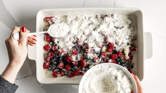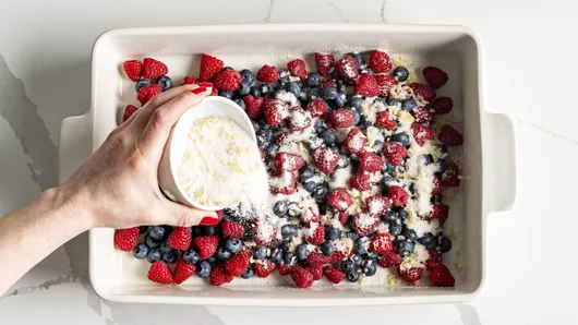 Step2Spread berries evenly in bottom of pan. In small bowl, mix sugar, ginger and lemon peel; sprinkle over berries. Drizzle lemon juice over top.