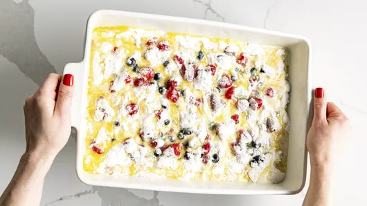 This berry-loaded beauty gets its name from its ease of preparation. All you need to do is dump a few simple ingredients into a 13x9 baking dish and pop it in the oven for a mindless treat that’s ready in no time. The fresh blueberries and raspberries give this cake a sweet, summery flavor and a touch of lemon juice and grated lemon peel give it a nice burst of citrus. Serve with a scoop of vanilla ice cream and you’ll have yourself a warm-weather dessert that’s guaranteed to please all season long.