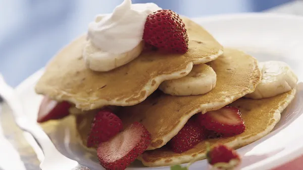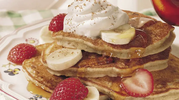 Step3For each pancake, pour scant 1/4 cup batter onto hot griddle. Cook about 1 1/2 minutes or until pancakes are puffed. Turn and cook other sides until golden brown and dry around edges. Serve pancakes with topping.