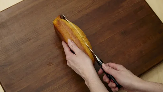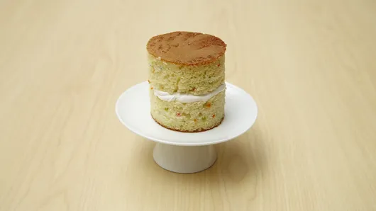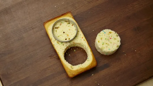 Step4Trim rounded top off loaf cake. Using 3-inch biscuit cutter, cut 2 rounds from loaf cake. Place one round cake cut side up on plate. Spread cut side with frosting. Top with remaining round cake, cut side down.