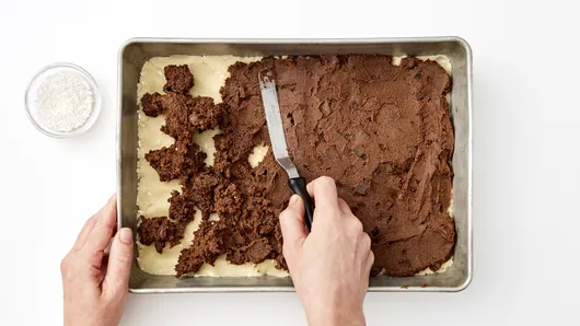 Step3Make double chocolate chunk cookie dough as directed on pouch. Drop dough by spoonfuls over sugar cookie dough. Using metal spatula, evenly spread dough to cover sugar cookie dough layer. Sprinkle remaining 2 tablespoons candy sprinkles over top.