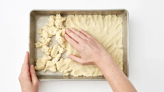 Step2Make sugar cookie dough as directed on pouch for drop cookies. Stir in 1/4 cup of the candy sprinkles. Press dough evenly in bottom of pan.