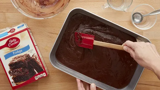 Make brownie batter as directed on box. Spread in pan. Bake 19 minutes.