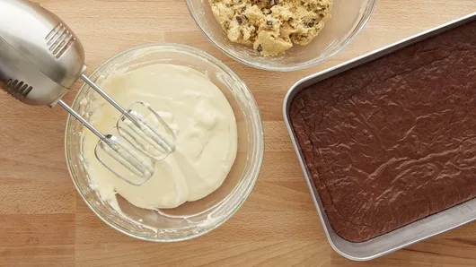 Spread cheesecake layer mixture over hot brownie base. Drop cookie dough by teaspoonfuls over cheesecake layer.