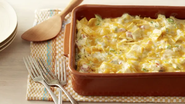 Step2Spray 13x9-inch (3-quart) glass baking dish with cooking spray. Arrange 6 tortillas on bottom and up sides of dish, overlapping slightly. Top with half of the chicken mixture. Continue layering, ending with chicken mixture. Top with cheese.