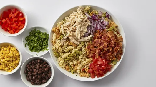 Add pasta, chicken, bacon, beans, corn, bell pepper, tomato, cilantro and red onion to dressing mixture in bowl; toss to gently coat. Serve immediately, or cover and refrigerate until serving.